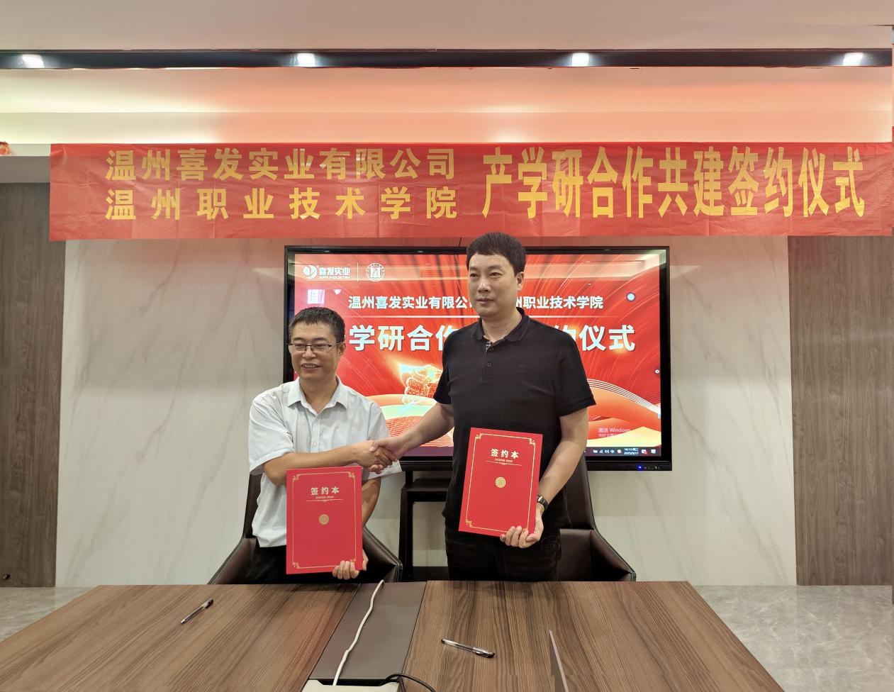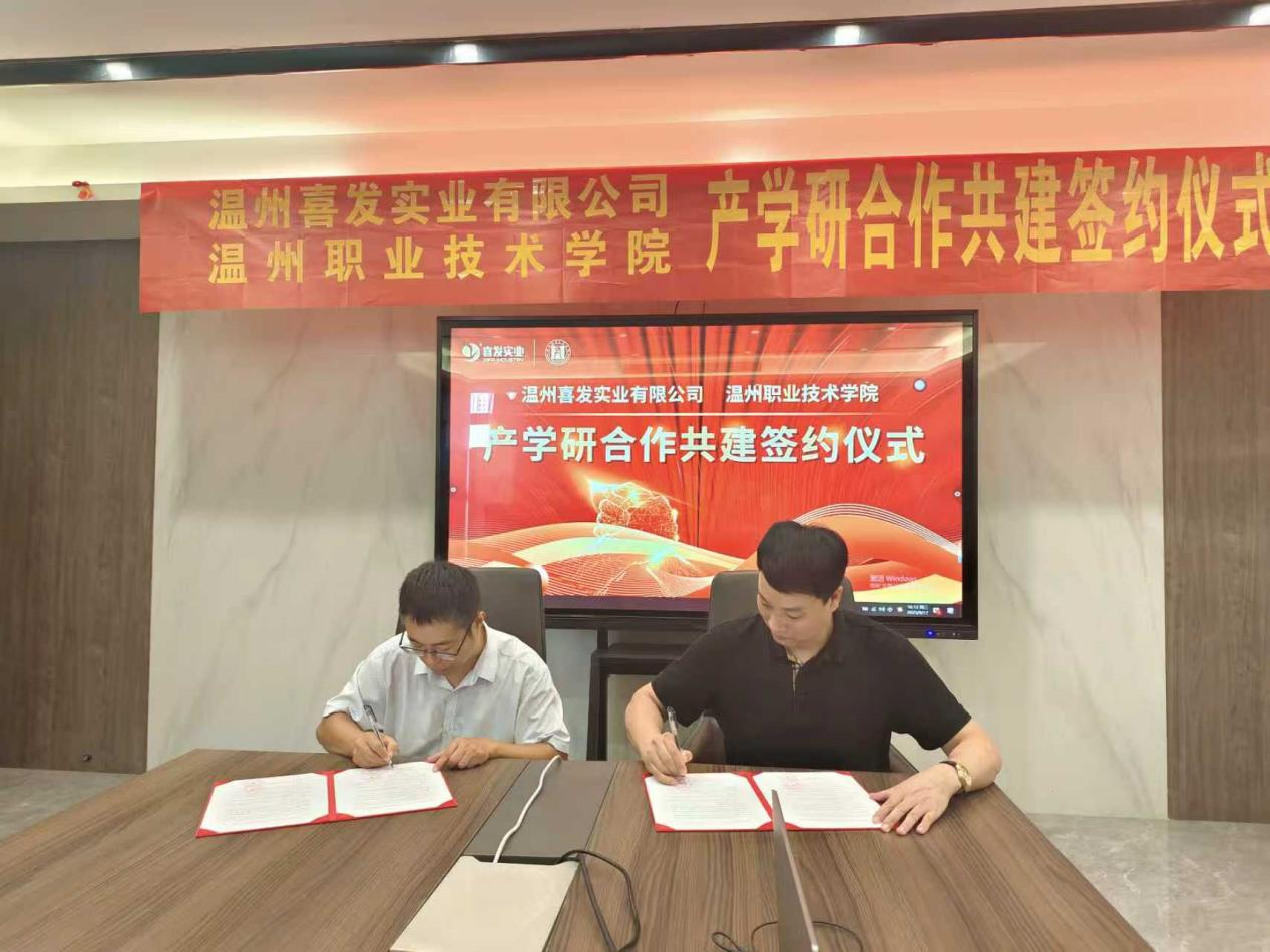 (喜發(fā)實(shí)業(yè)總經(jīng)理陳顯行與溫職院李敏濤教授共同簽訂協(xié)議)